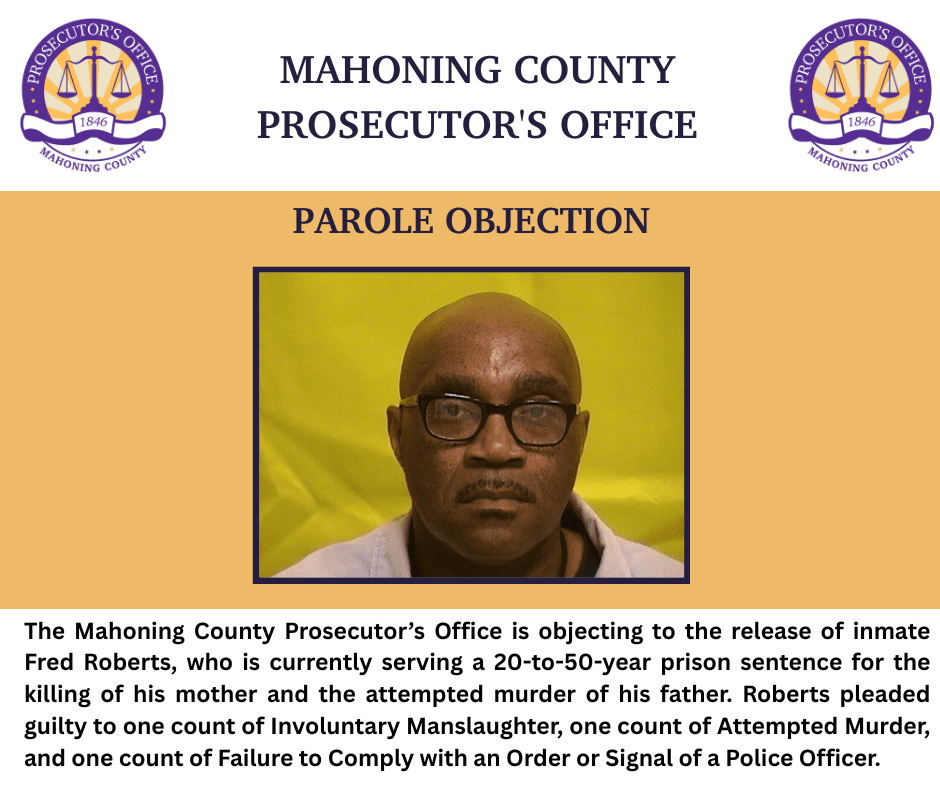 YOUNGSTOWN, Ohio – The Mahoning County Prosecutor’s Office is objecting to the release of inmate Fred Roberts, who is currently serving a 20-to-50-year prison sentence for the killing of his mother and the attempted murder of his father.
