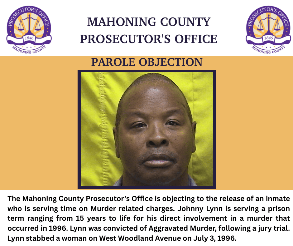 YOUNGSTOWN, Ohio – The Mahoning County Prosecutor’s Office is objecting to the release of an inmate who is serving time on Murder related charges. Johnny Lynn is serving a prison term ranging from 15-years-to-life for his direct involvement in a murder that occurred in 1996.