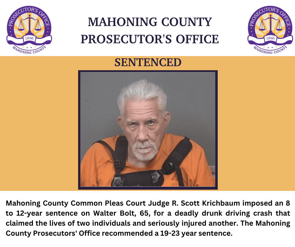 YOUNGSTOWN, OH – Walter Bolt, 65, has been sentenced to 8 to 12 years in prison for his role in a deadly drunk driving crash that claimed the lives of two individuals and seriously injured another. Mahoning County Common Pleas Court Judge R. Scott Krichbaum sentenced Bolt. In July of 2025, Bolt entered guilty pleas to two counts of Aggravated Vehicular Homicide, felonies of the second degree, and one count of Aggravated Vehicular Assault, a felony of the third degree, and one count of Operating a Vehicle Under the Influence of Alcohol, or a Drug of Abuse, or a Combination of them, a misdemeanor of the first degree. As part of his plea, Bolt will receive a mandatory lifetime driver’s license suspension.