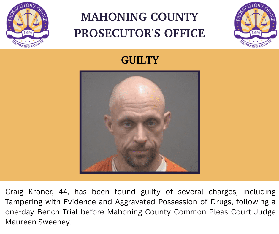 YOUNGSTOWN, Ohio – Craig Kroner, 44, has been found guilty on multiple charges, including Tampering with Evidence and Aggravated Possession of Drugs, following a one-day bench trial before Mahoning County Common Pleas Court Judge Maureen Sweeney. Kroner was convicted of Tampering with Evidence, Aggravated Possession of Drugs, Obstructing Official Business, Resisting Arrest, and Illegal Use or Possession of Drug Paraphernalia. Assistant Prosecutor Patrick Fening successfully prosecuted the case.